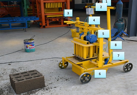 QMJ2-40 mobile block machine, it no needs to use carriage plates. For less investment and quicker forming, it is an ideal choice for small-sized block factory. Only with1—2 workers, it is enough for operating this machine.